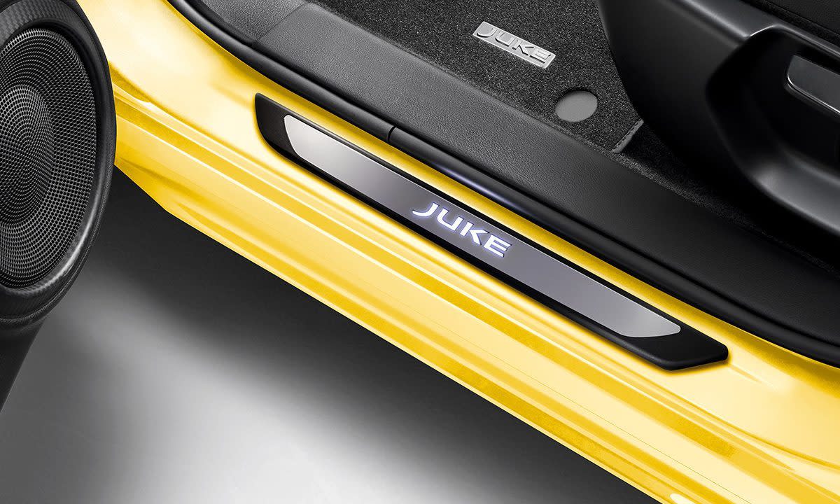 Stylise your JUKE's interior and keep your gear organised and secure with Nissan Genuine Accessories. Illuminated Kick Plates shown.